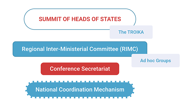 The Summit held in Nairobi in 2007 established the Regional Follow-up Mechanism to facilitate the implementation of the Pact. These include the Summit of Heads of State and Government, the Regional Inter-ministerial Committee, the Secretariat of the Conference, the National Coordination Mechanisms, the Collaborative Mechanism and other specific structures or Fora, as appropriate, to ensure the implementation of the Pact.