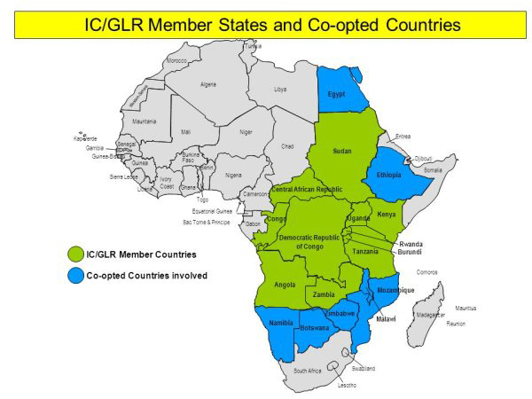 The International Conference on the Great Lakes Region (ICGLR) fosters peace and development across twelve member states: Angola, Burundi, Central African Republic, Republic of Congo, Democratic Republic of Congo, Kenya, Uganda, Rwanda, South Sudan, Sudan, Tanzania, and Zambia.